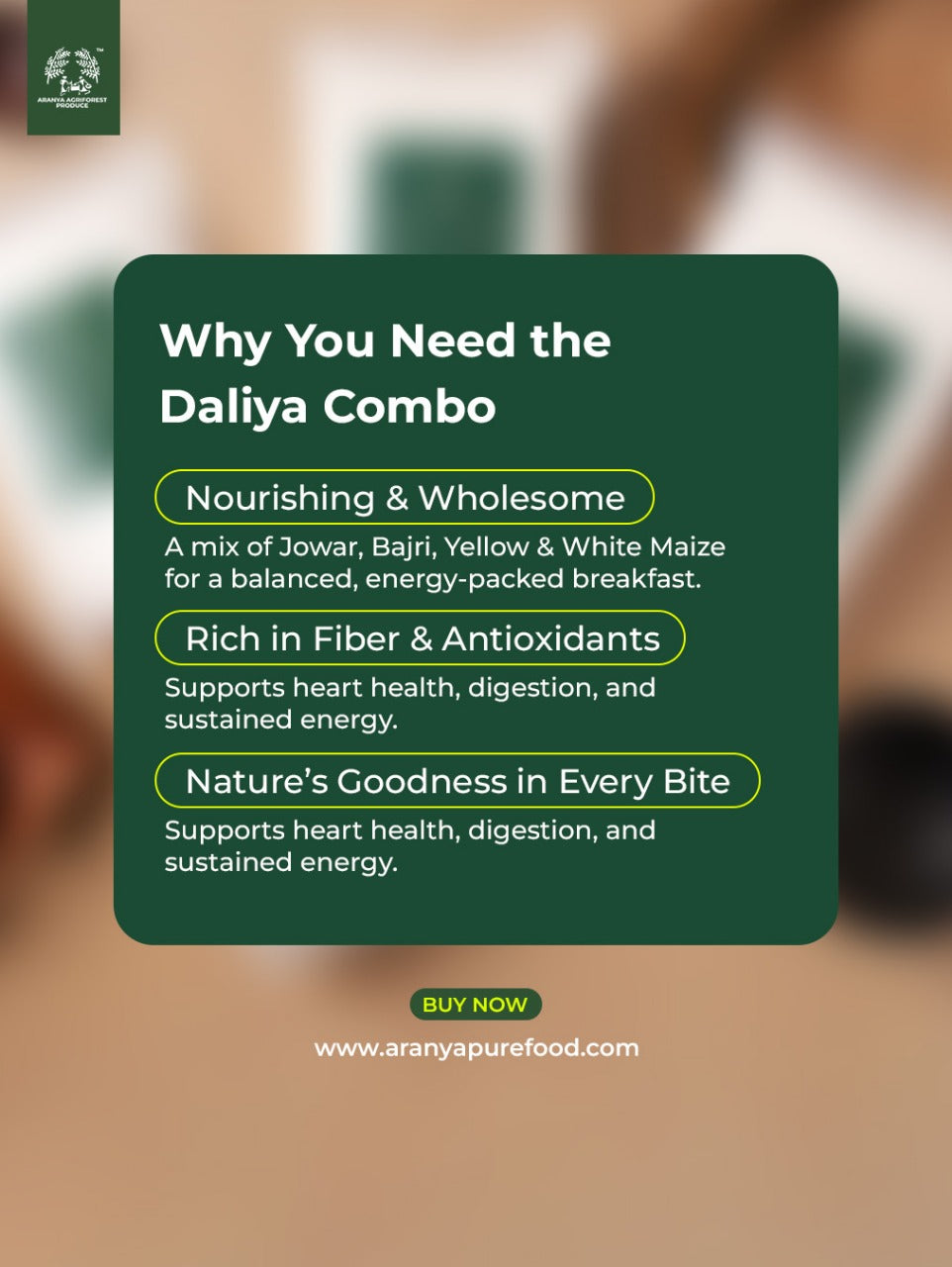 A nutritious multigrain combo of Jowar, Bajri, Makai Yellow, and Makai White. Ideal for porridge, upma, or healthy daily meals. Freshly milled for superior taste and natural goodness.