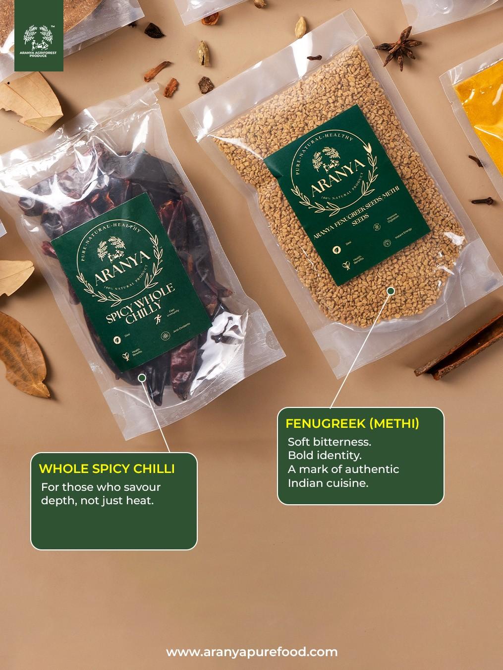 Experience the purity, aroma, and flavour of traditional Indian cooking with Aranya’s premium 8-spice collection. Each spice is naturally sourced, carefully cleaned, and packed to preserve freshness and potency. Perfect for everyday home cooking, gourmet recipes, or gifting.